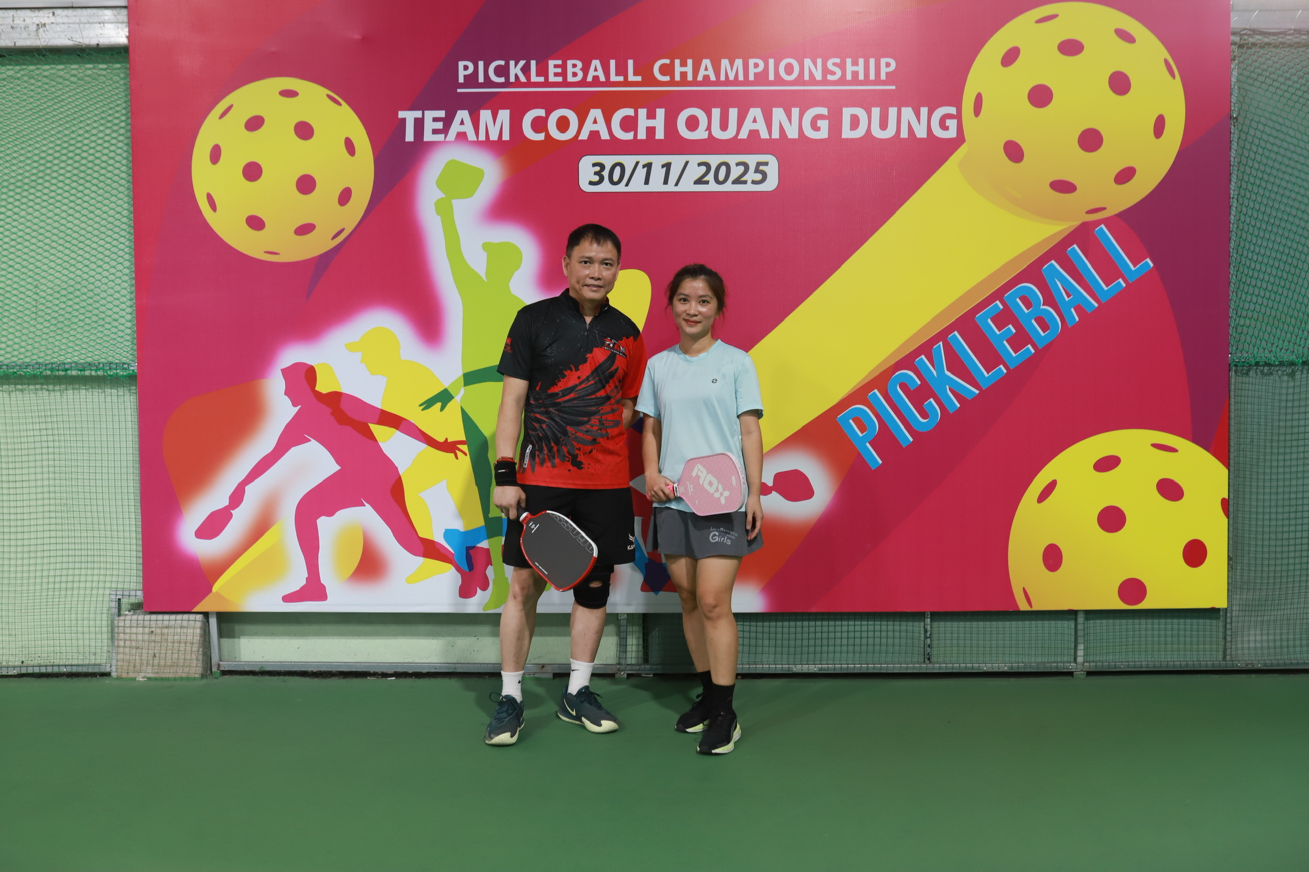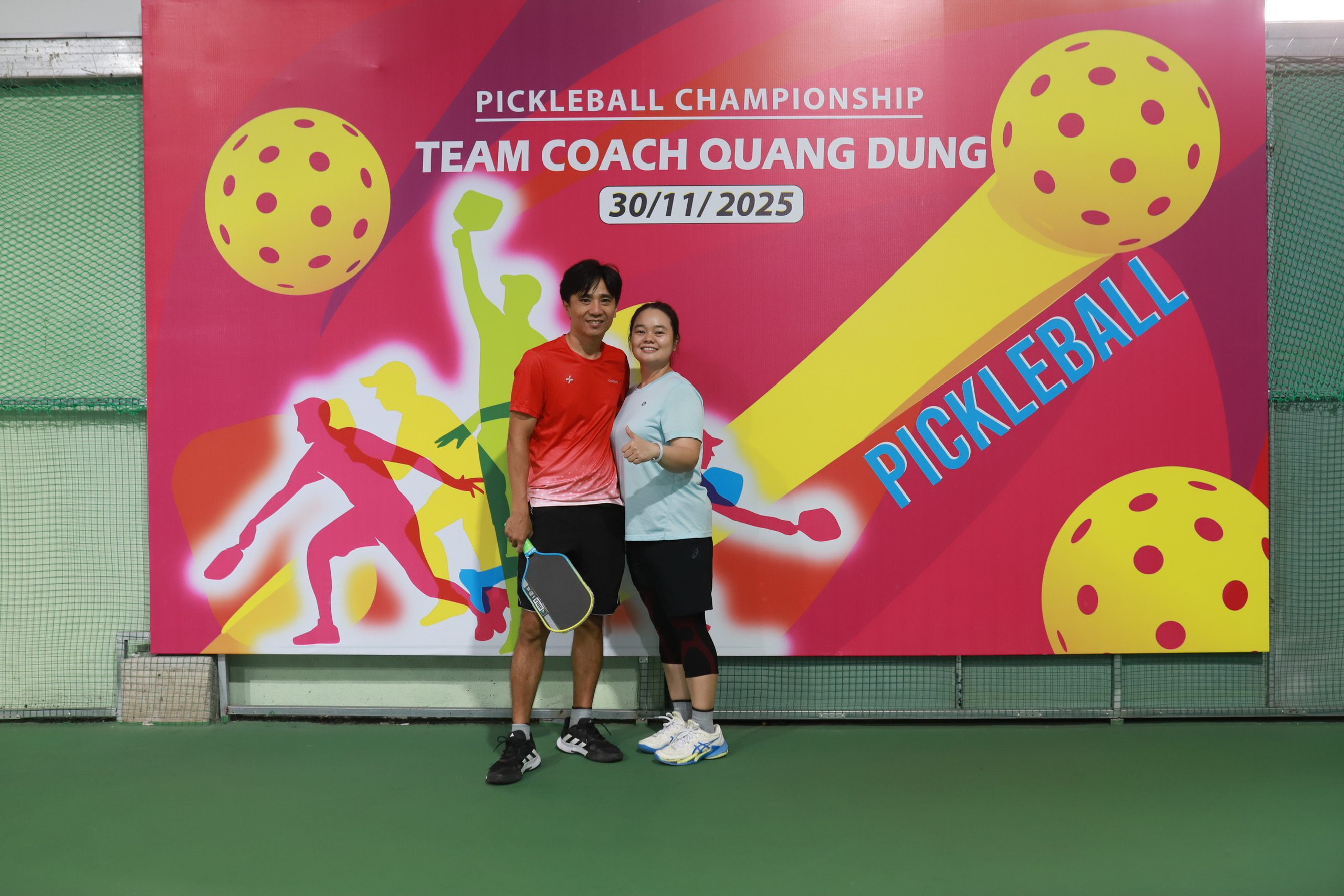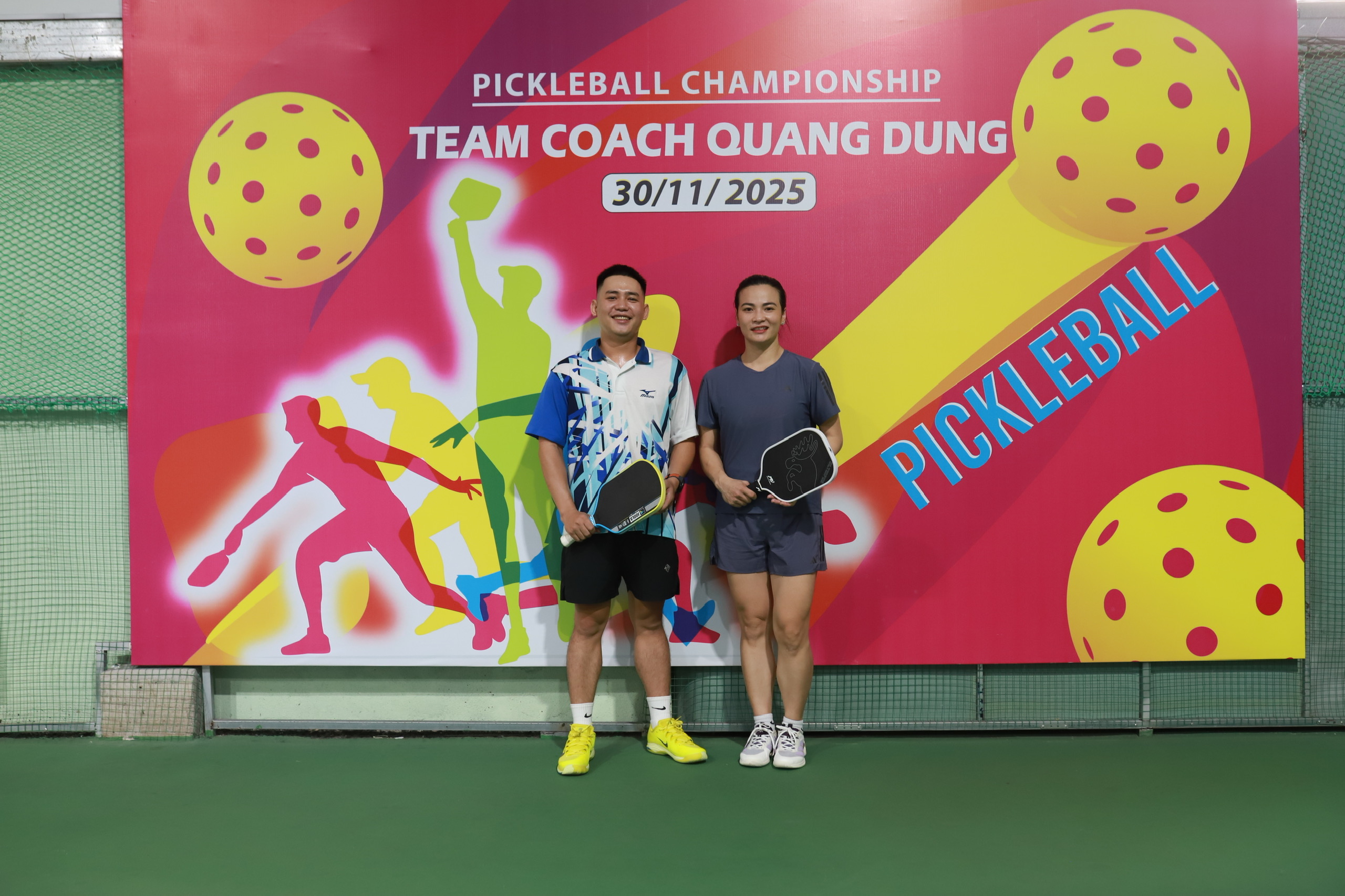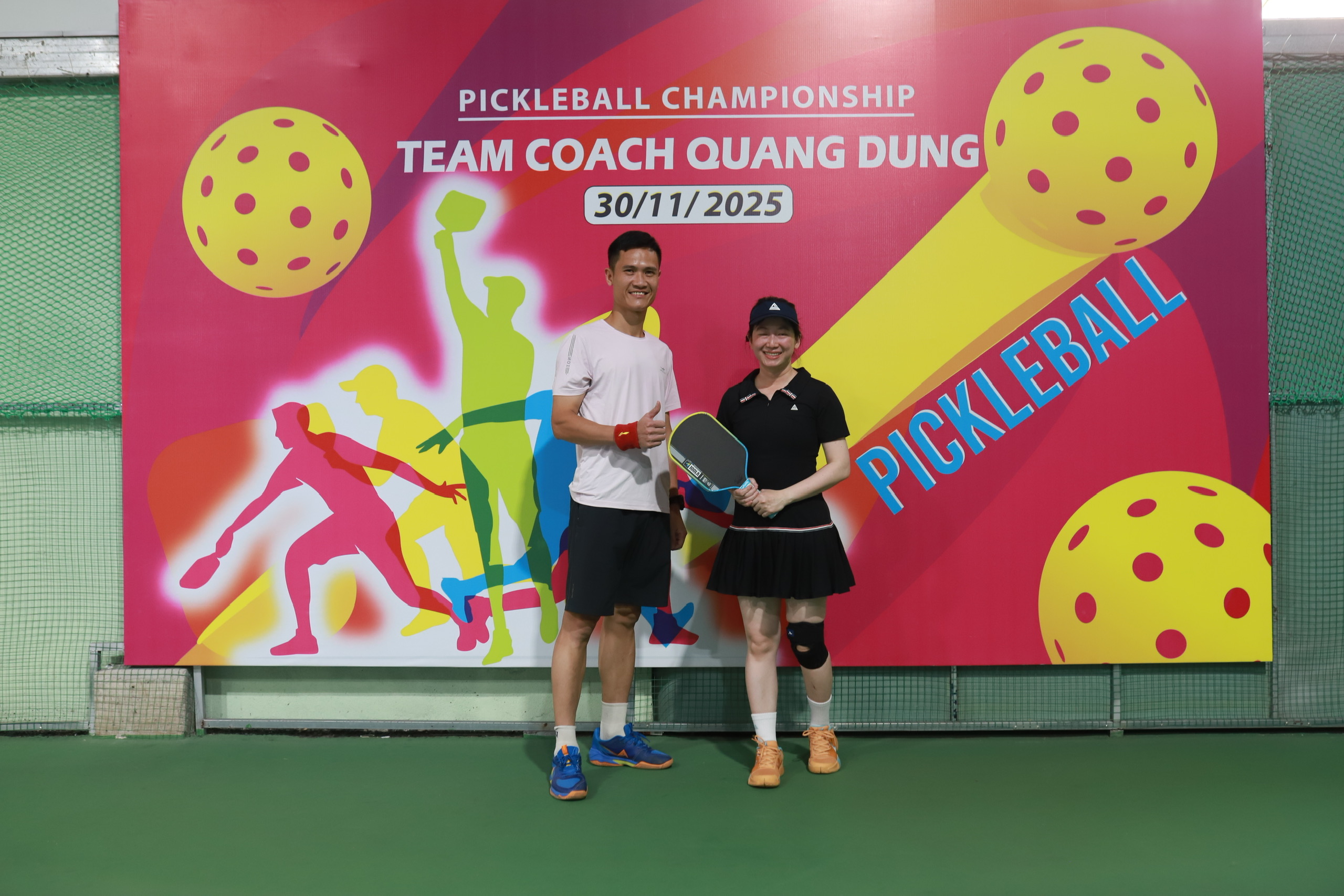 Ở trung tâm của một trong những bức ảnh nổi bật nhất là hai vận động viên trẻ đầy năng lượng. Cả hai đều đứng trước backdrop giải đấu với logo, màu sắc và thông điệp “Pickleball Championship – Team Coach Quang Dũng”. Họ cầm trên tay cây vợt pickleball và nở nụ cười tự tin – biểu tượng của tinh thần thi đấu hết mình nhưng vẫn giữ được sự thân thiện, gắn kết đặc trưng của môn thể thao này.