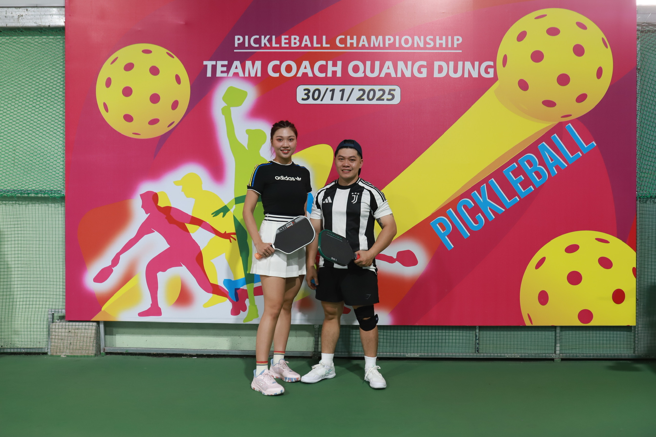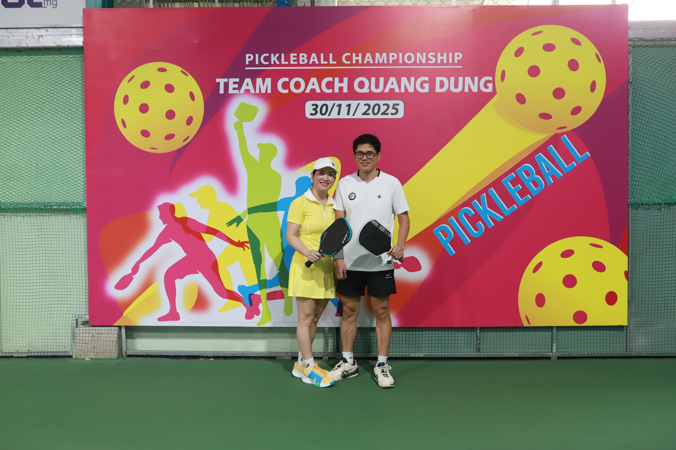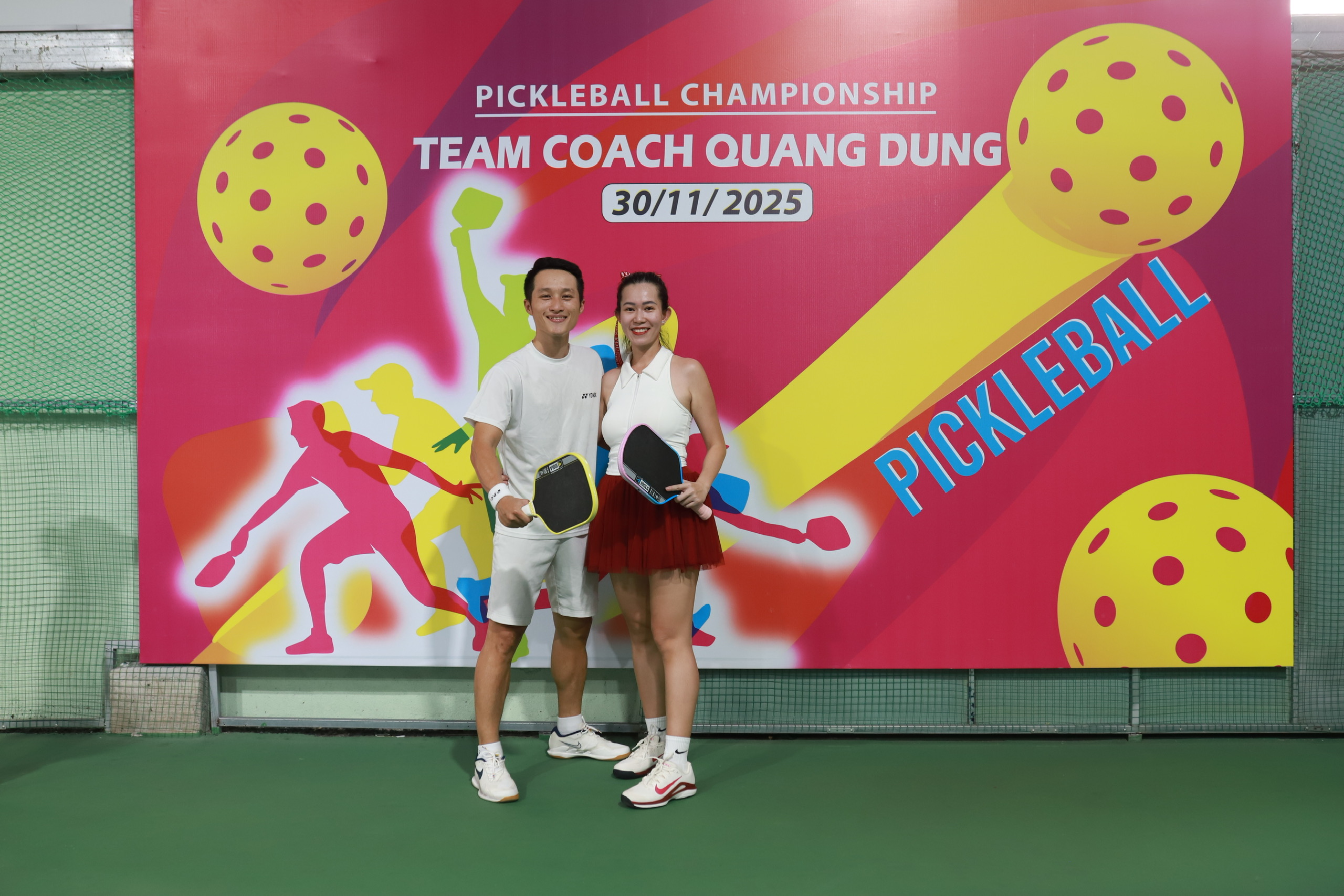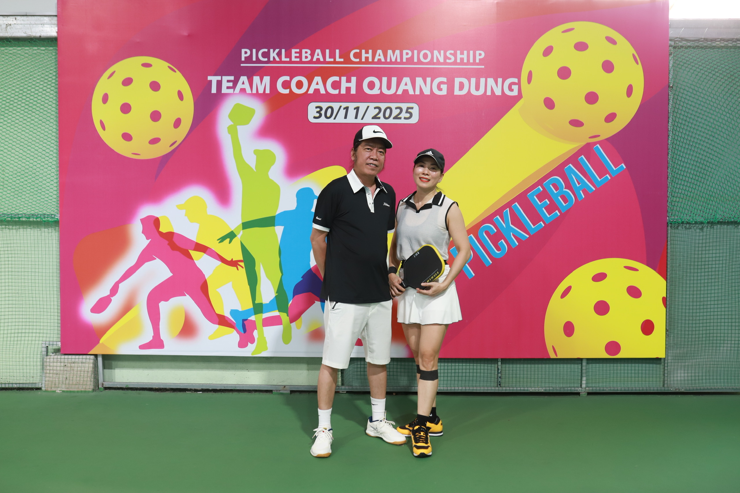 Ở trung tâm của một trong những bức ảnh nổi bật nhất là hai vận động viên trẻ đầy năng lượng. Cả hai đều đứng trước backdrop giải đấu với logo, màu sắc và thông điệp “Pickleball Championship – Team Coach Quang Dũng”. Họ cầm trên tay cây vợt pickleball và nở nụ cười tự tin – biểu tượng của tinh thần thi đấu hết mình nhưng vẫn giữ được sự thân thiện, gắn kết đặc trưng của môn thể thao này.